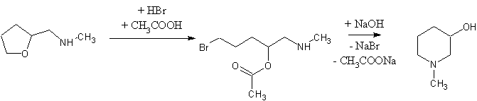 В трехгорлую колбу на 500 мл, снабженную обратным холодильником, термометром и барботером, помещают 78 г (0,68 М) тетрагидрофурфурилметиламина и 45 мл ледяной уксусной кислоты. Смесь нагревают до 100° и при температуре 100—110° в течение 3—4 часов пропускают 113,4 г (1,4 М) бромистого водорода. Затем к реакционной смеси осторожно при охлаждении прибавляют раствор 250 г (6,2 М) едкого натра в 300 мл воды и смесь перегоняют с водяным паром. Дистиллят при охлаждении насыщают твердой щелочью и выделившееся масло отделяют. Водный слой экстрагируют эфиром и сушат углекислым калием. Эфир отгоняют, а остаток перегоняют в вакууме, собирая две фракции: первую с т. кип. до 80°/15 мм, представляющую собой смесь тетрагидрофурфурилметиламина и N-метил-3-оксипиперидина (первая фракция в количестве 16 г возвращается для расщепления), и вторую с т. кип. 80—82°/15 мм, представляющую собой чистый N-метил-3-оксиипиперидин.